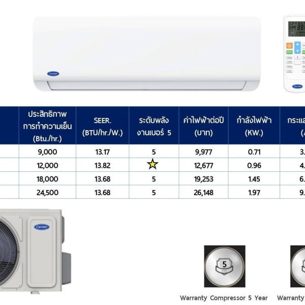 Carrier รุ่น 42TSAA013 (Copper 7) ติดผนัง ขนาด 12200 บีทียูเบอร์ 5 (R32) ราคาไม่รวมติดตั้ง
