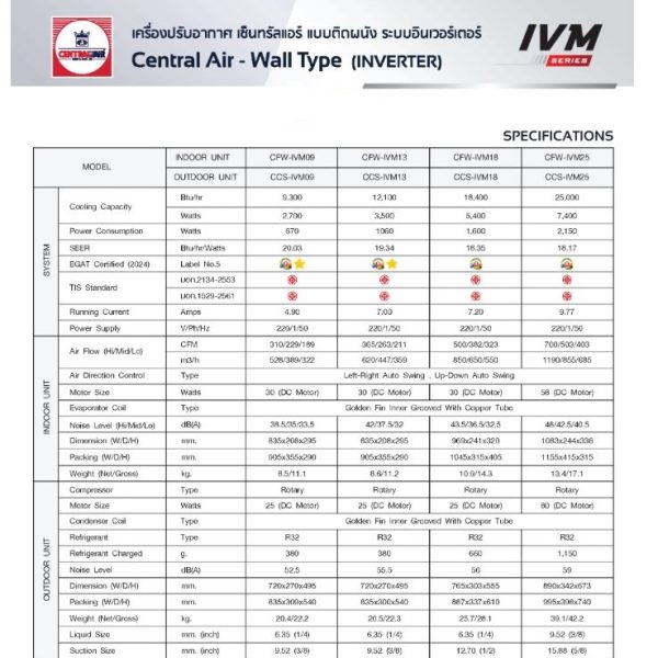 แอร์ CENTRAL AIR รุ่น CFW-IVM INVERTER ขนาด 9000 – 28000 BTU ราคาไม่รวมติดตั้ง