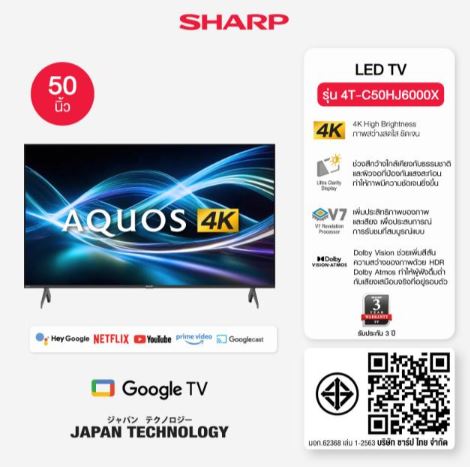 SHARP LED GOOGLE TV 4K SMART TV 50 นิ้ว รุ่น 4T-C50HJ6000X สินค้าใหม่ ประกันศูนย์ 3 ปี