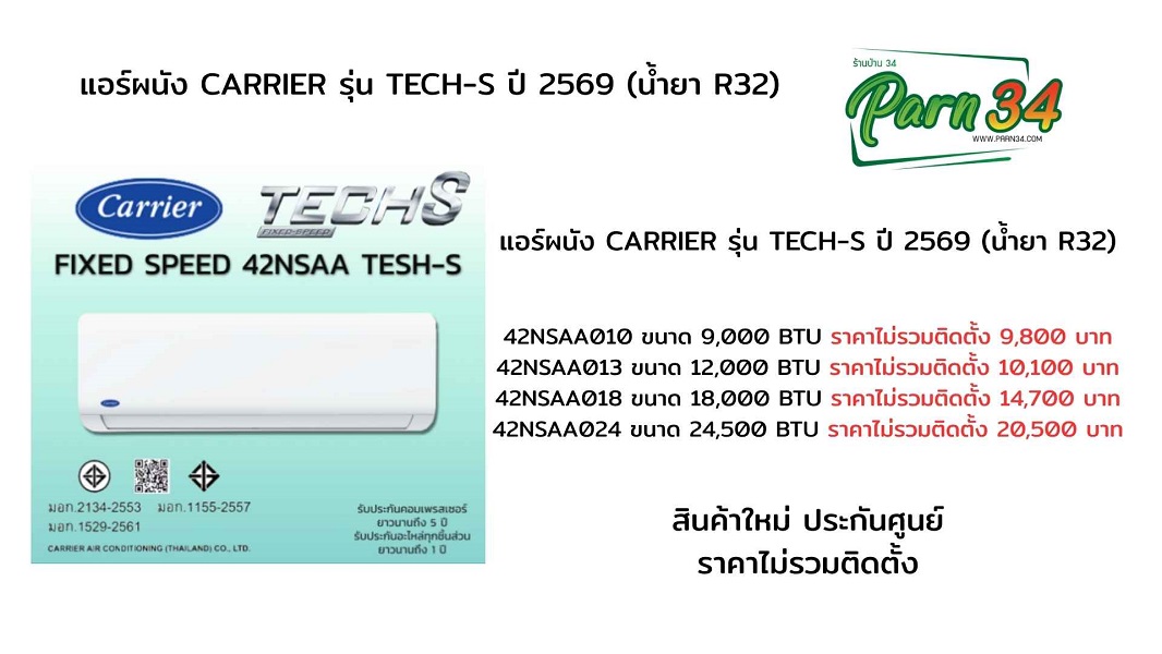แอร์ผนัง CARRIER รุ่น TECH-S ปี 2569 (น้ำยา R32)