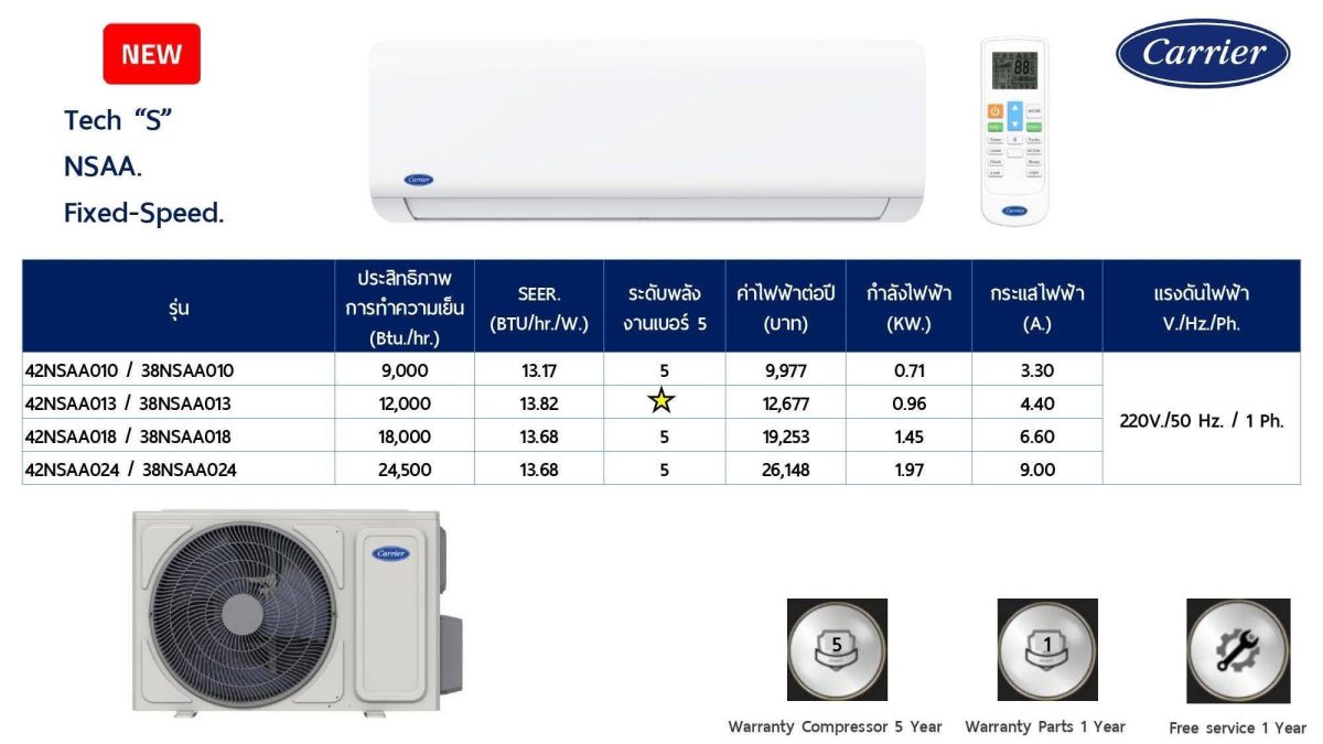 42NSAA013 ขนาด 12,000 BTU ราคาไม่รวมติดตั้ง 10,100 บาท