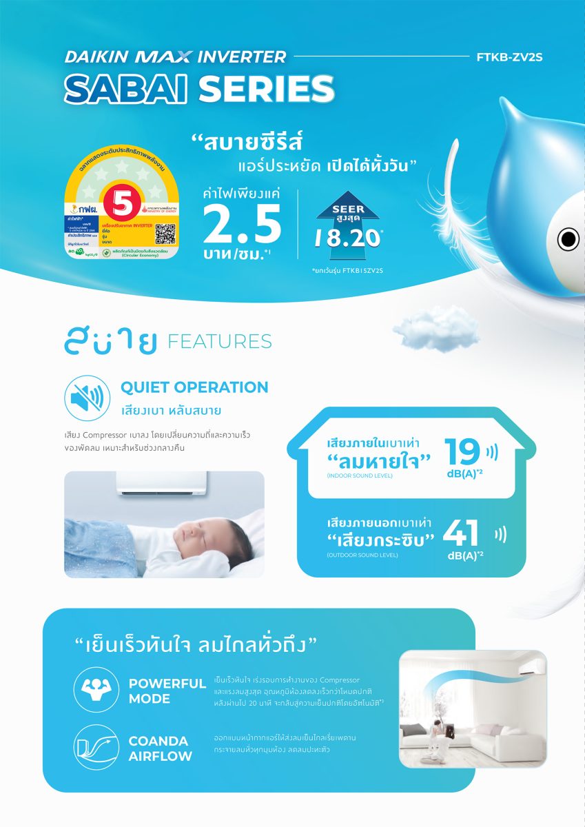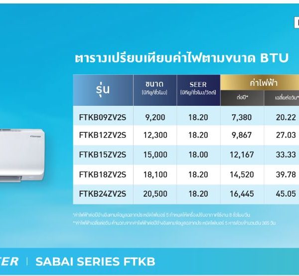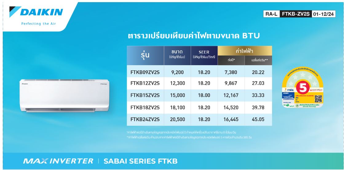 - ประหยัดไฟเบอร์ 5 ด้วยค่า SEER สูงสุดที่ 18.20* ให้คุณประหยัดค่าไฟฟ้าในทุกการใช้งาน ค่าไฟเพียง 2.5 บาท/ชม. * รุ่น ยกเว้นรุ่น FTKB15ZV2S
