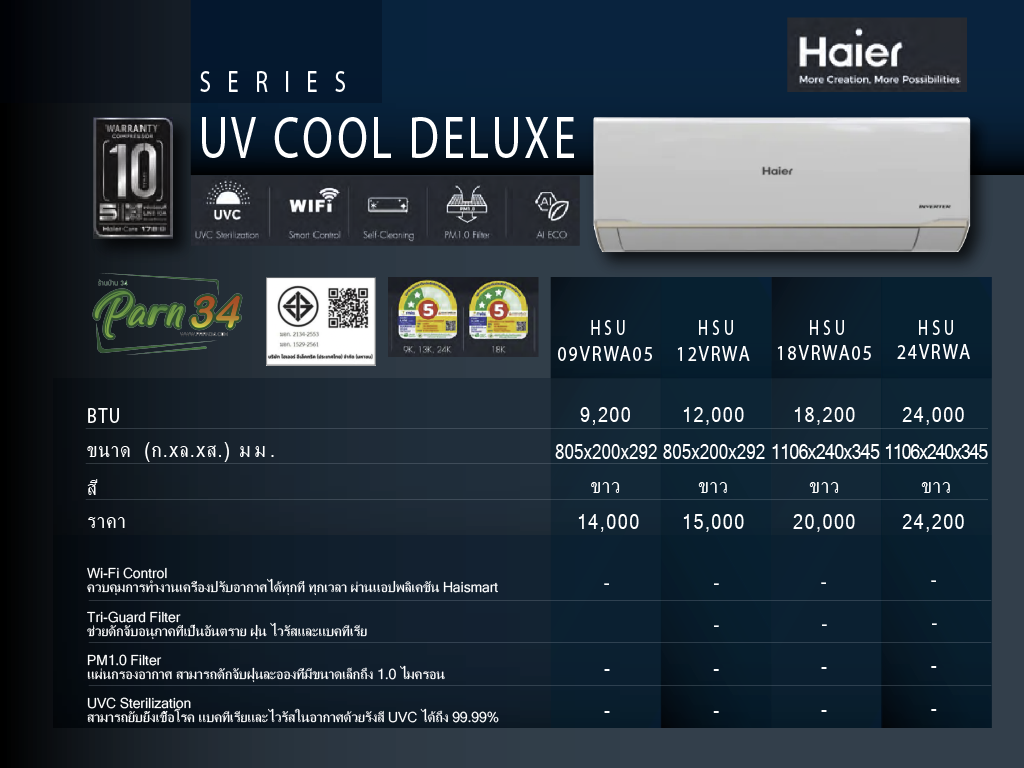 แอร์ Haier ติดผนังอินเวอร์เตอร์ (WIFI INVERTER Wall Type) เบอร์ 5 น้ำยา R32 รุ่น UV COOL DELUXE VRWA ขนาด 9,200BTU-24,000BTU